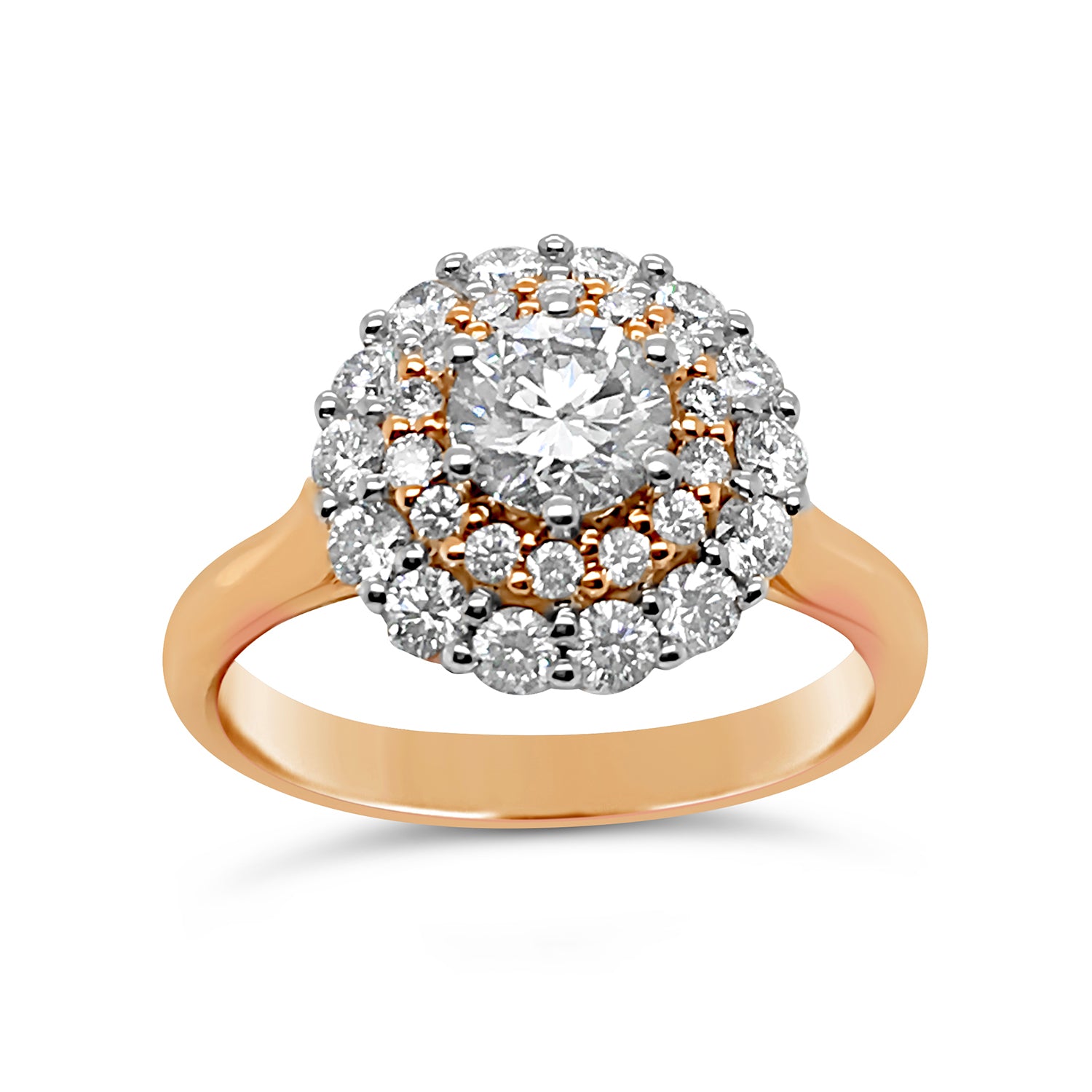 18ct Rose & White Gold 1x0.50ct + 28=0.67ct GH/SI Round Brilliant Cut Diamond Double Halo Ring Size L
