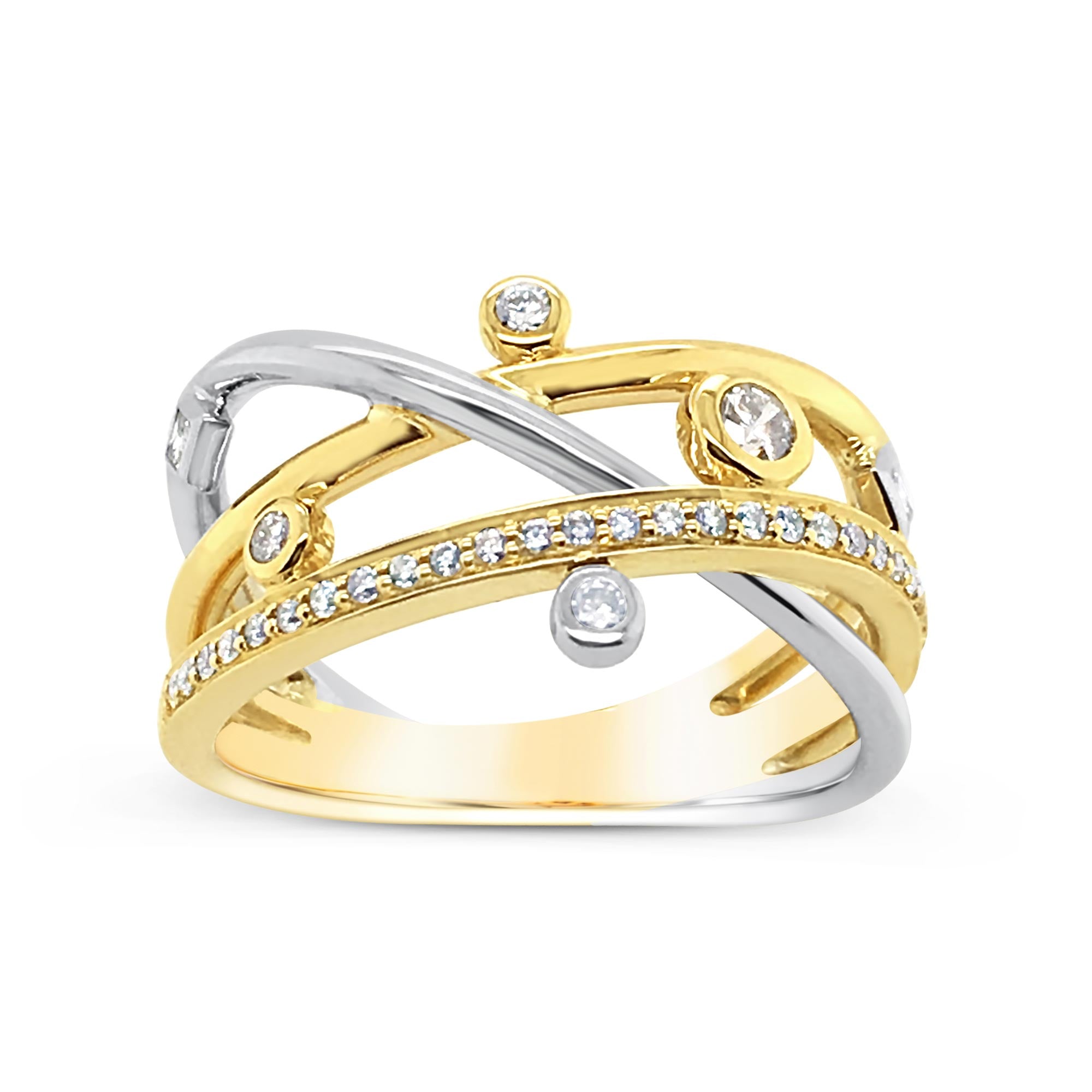 9ct Yellow & White Gold 32=0.31ct TW Princess and Round Brilliant Cut Diamond Crossover Band Dress Ring