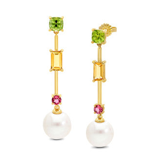 9ct Yellow Gold Pearl, Peridot, Citrine & Tourmaline Long Drop Earrings