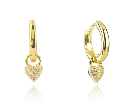 Sterling Silver & Yellow Gold Plated Hoop with Cubic Zirconia Detachable Pave Set Heart Charm Huggie Earrings